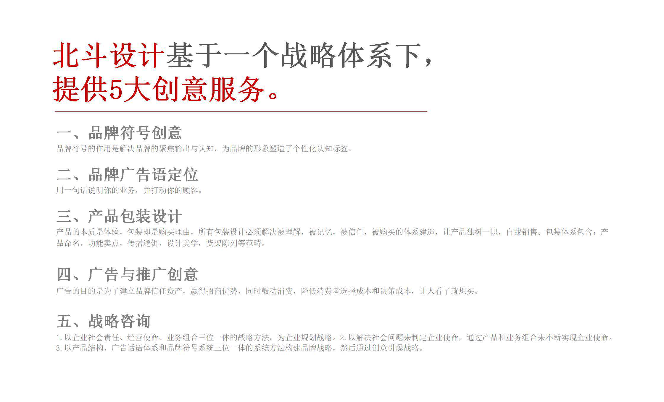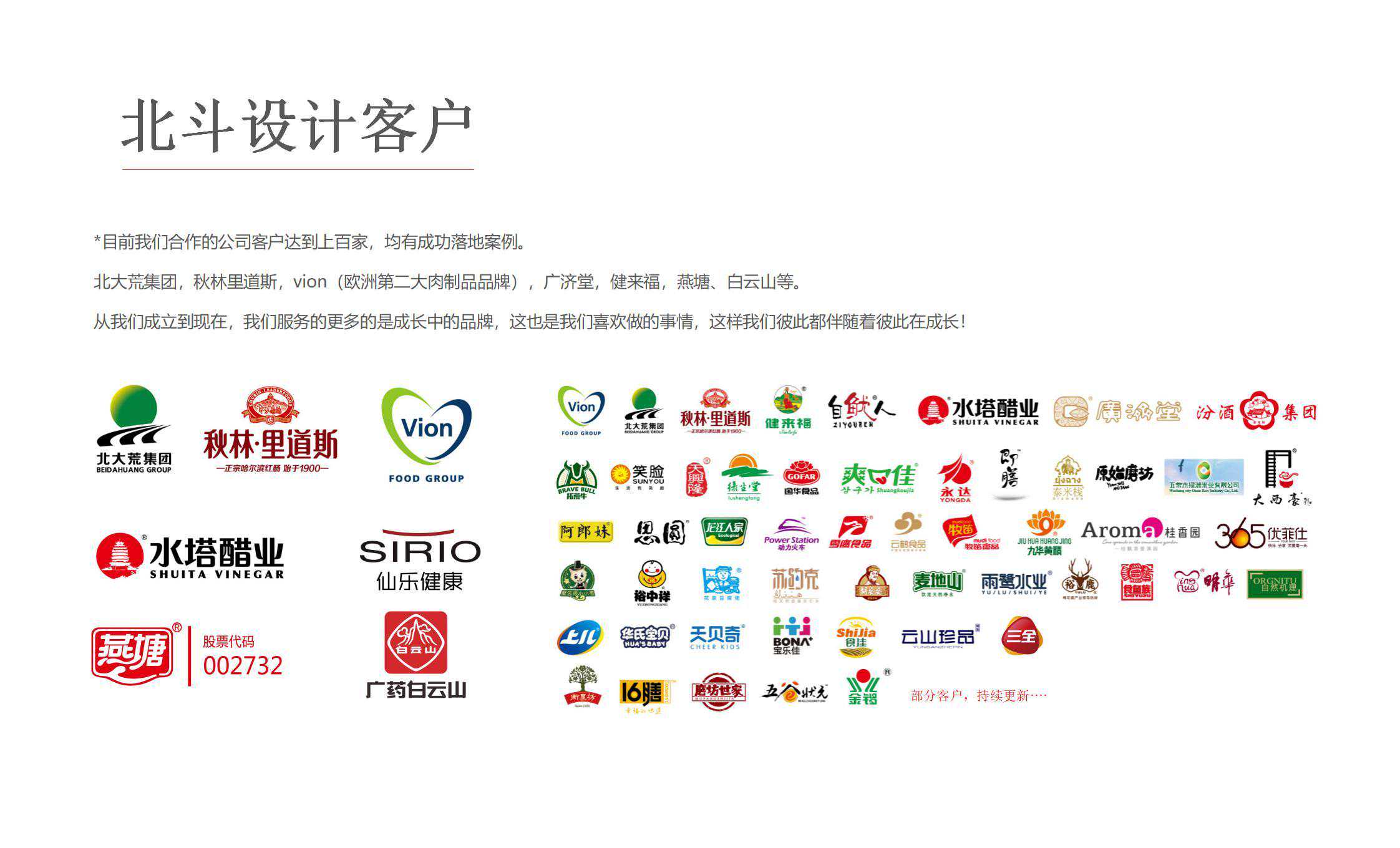 广州北斗设计有限公司于2014年成立,由符新华及武相成两位先生共同创办,我们秉承“真人,真心,真实力”为经营理念,为企业品牌、产品打造更具竞争优势的品牌战略设计。创办7年来,北斗设计以“产品战略包装设计”为营销突破口,秉承“战略+创意”相互赋能的设计理念,为品牌、产品构建顶层设计,并提供企业战略、产品战略、品牌战略三位一体的战略规划和创意服务。