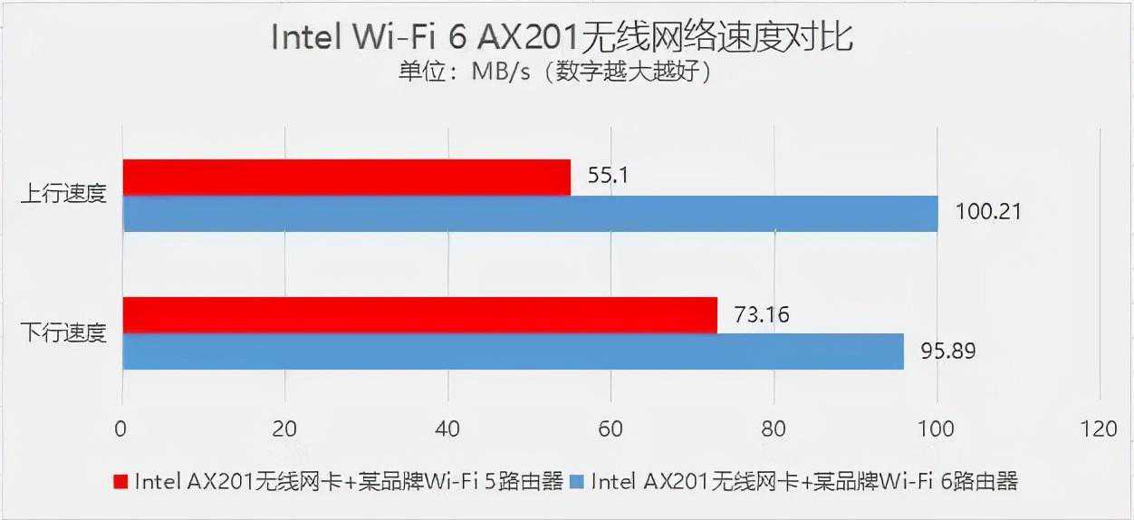 对于普通用户,WiFi6还有多远中关村在线测试了英特尔WiFi6AX201无线网卡分别与WiFi6和WiFi5路由器进行连接,实测上下行速度如下: