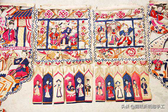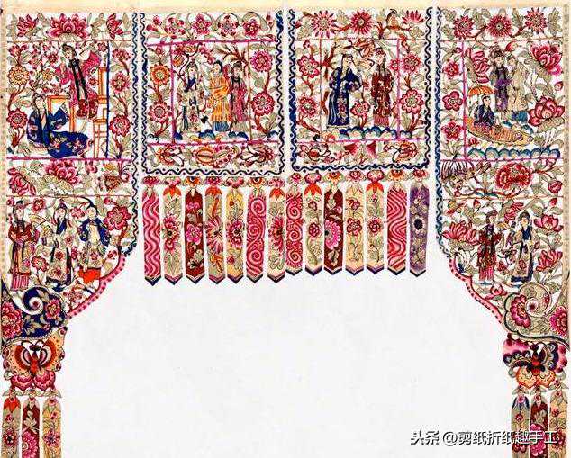 戏曲窗裙不但精要地叙述了戏曲故事的情节,还把舞台上五彩缤纷的人物形象、扮相、身段、道具都能一一描绘出来。它是戏曲这种时空艺术的精华。这独具心思、意念的剪纸艺术,是戏曲艺术、手绘年画、和剪纸艺术的结晶。