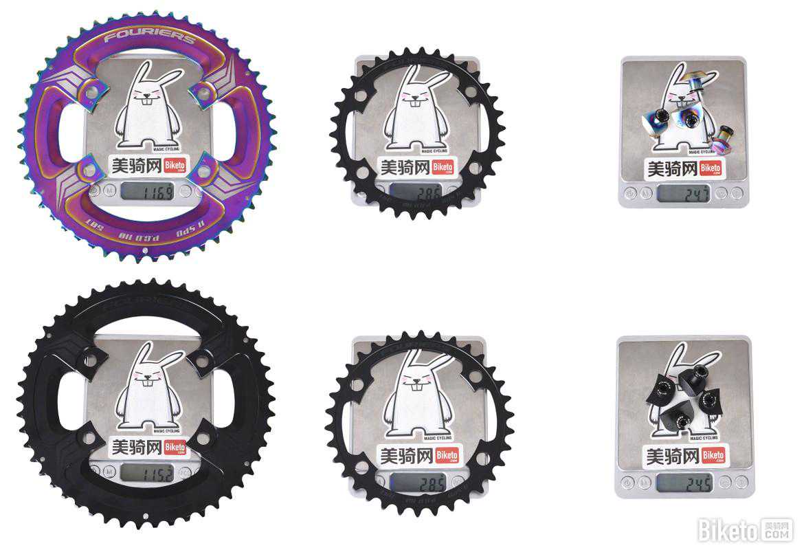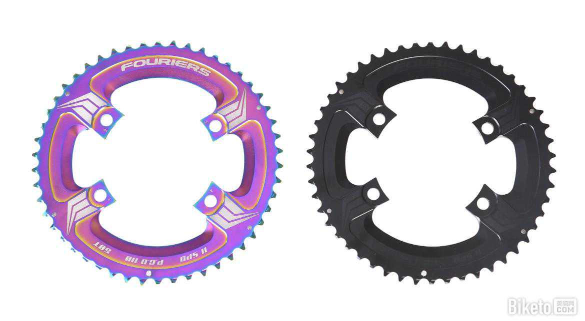 富律业在近日推出了一款7075-T651铝合金盘片套装,有CR-SHM110-58、CR-SHM110-68、CR-SHM110-90三个型号,分别适用于105(5800)、Ultegra(6800)、Dura-Ace(9000)三款ShimanoPCD110公路四爪牙盘,提供黑、红、蓝、绿、镀钛,五个配色风格,50-34T、52-36T、53-39T三种齿数搭配。