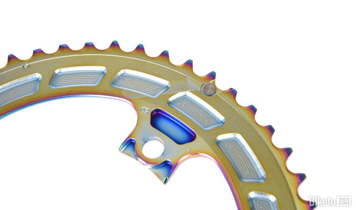 大盘盘片内有着四道原装5800盘片不具备的清晰导链槽,确保“小到大”变速时的效率。盘片内壁回字型的镂空已经超越了自身为盘片减重的作用,更像是富律业在铝合金处理技术的炫技。