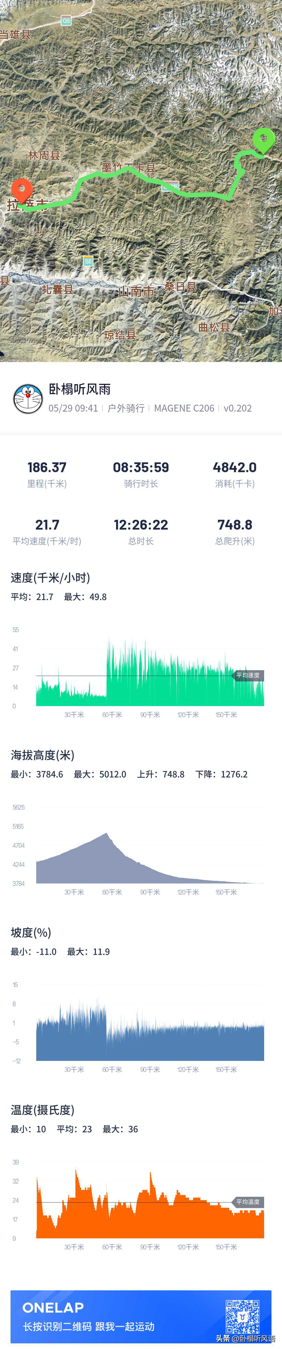 出门大约1km的平路,然后是5km多上坡,直到过了318大车俱乐部(),然后是9km下坡()、4km平路()。