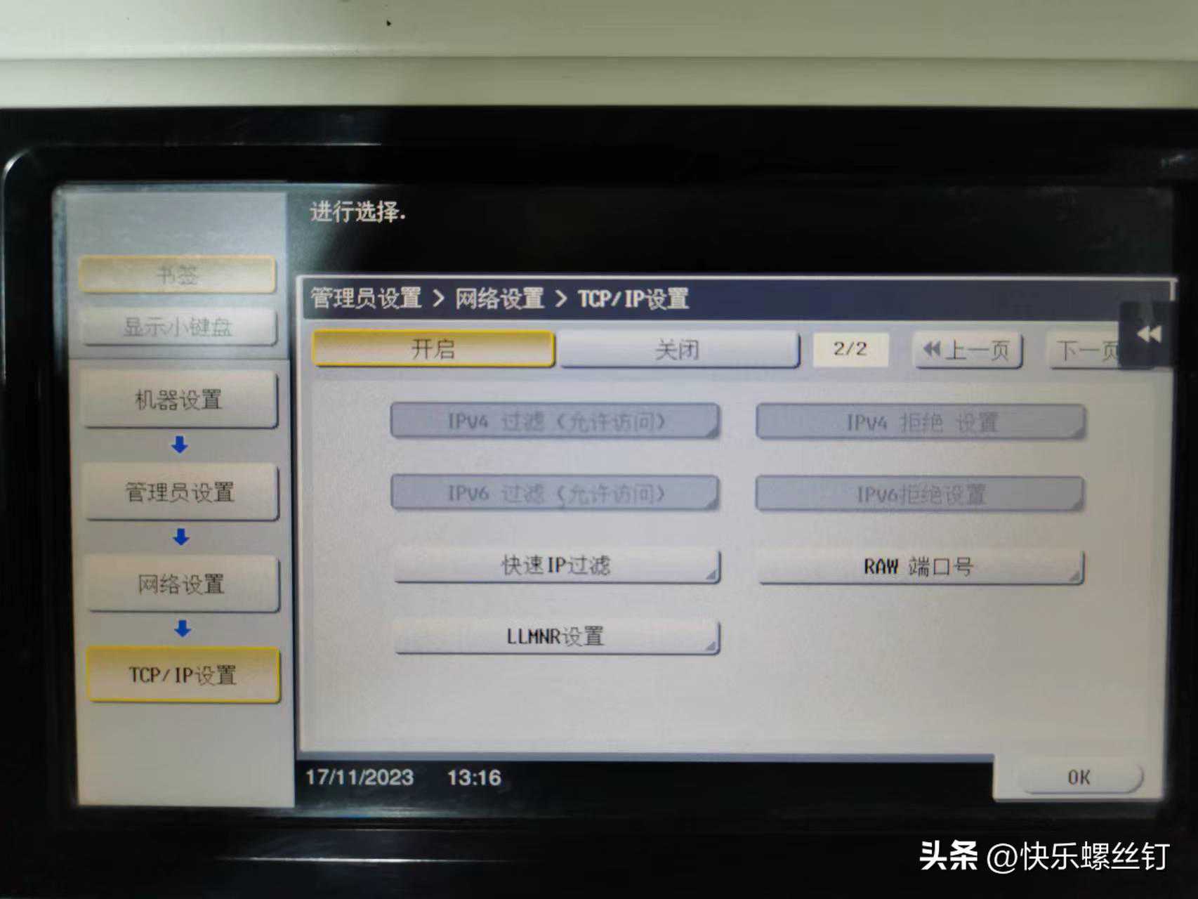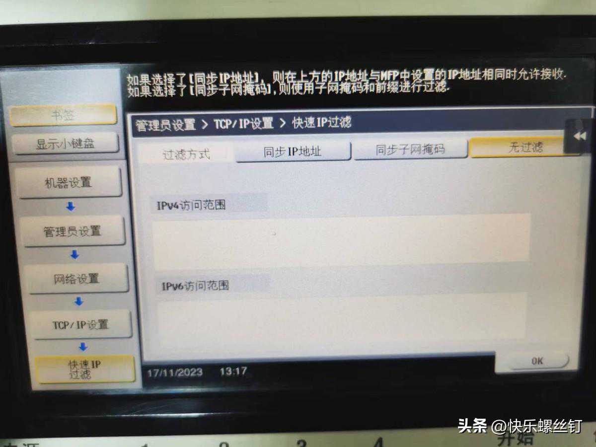 说明解释:柯美B227/B287/B367/C226/C266/C227/C287/C308/C368/C658/B958系列,使用ping命令可以ping通机器,但打印和扫描机器无响应,由于柯美新机型为了增加网络访问的安全性,默认开启了机器的快速IP过滤功能,保证了同网段电脑的访问,跨网段则无法使用打印等功能,遇到此类故障针对以上机型记得关闭“快速IP过滤”