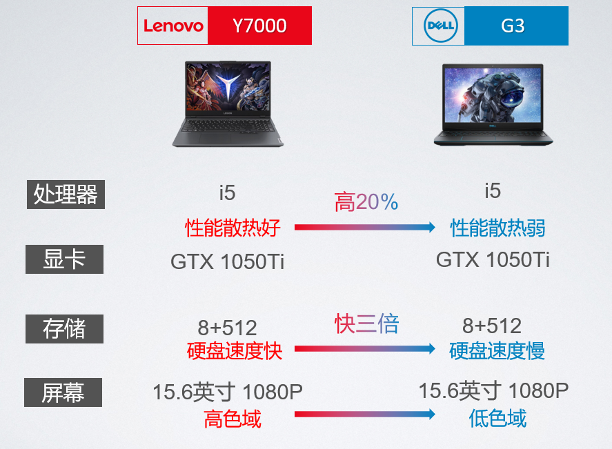 这里面主要的坑在于性能释放和散热,也就是说虽然看起来是一样的,但它们玩同一款游戏的帧率甚至能差出来20%,联想的硬盘要比戴尔的速度快三倍的样子。联想是高色域屏,戴尔是低色域屏,很多都是不能体现在表面上的数据。
