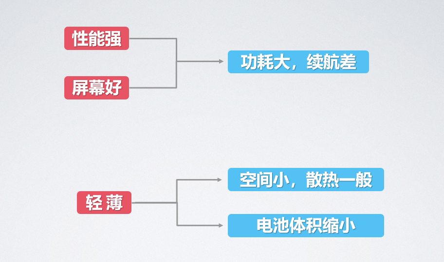 为什么呢?其实他的这些要求,每一条单独拿出来,都很正常,但合在一起就有问题了,因为产品的很多属性是会相互矛盾的,鱼和熊掌不可兼得,比如性能好往往就决定了它会更耗电,想要轻薄那就会牺牲散热能力和电池体积,使用了更好的材料和工艺,拥有更棒的品质感那售价自然就低不了,大品牌要铺更多的售后点,那这些成本自然也会算到产品的售价里。
