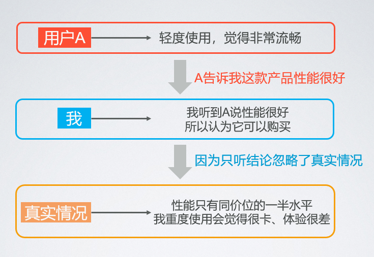 大家可能会想,他们都是真实的用户,肯定是第一手的体验,而且他们又不是网上的键盘侠,而是身边很熟悉的人,肯定不会骗我,所以听他们的应该没错。