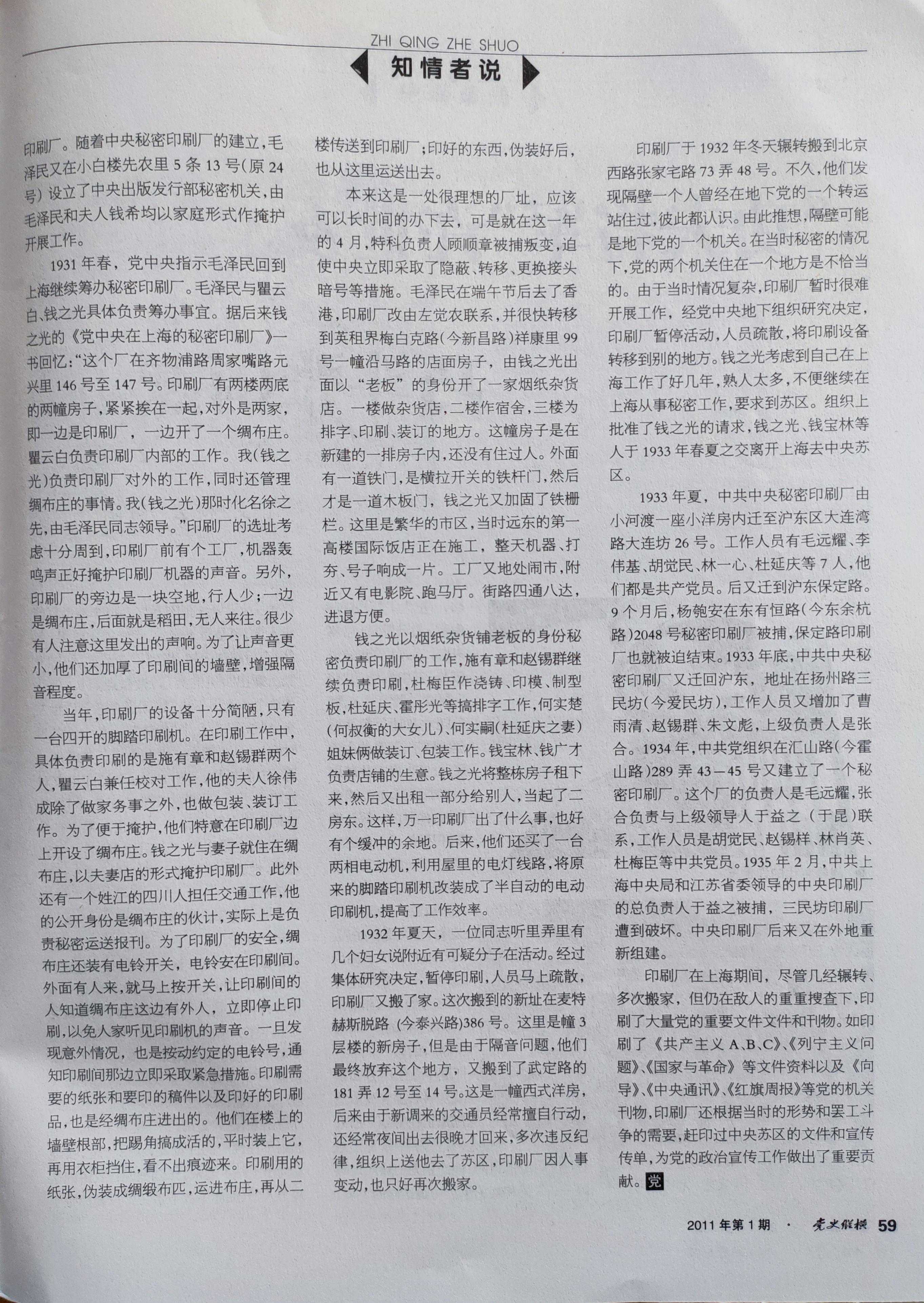 当年,印刷厂的设备十分简陋,只有一台四开的脚踏印刷机。在印刷工作中,具体负责印刷的是施有章和赵锡群两个人,瞿云白兼任校对工作,他的夫人徐伟成除了做家务事之外,也做包装、装订工作。绸布庄经营批发各种绸缎布匹,是专门为掩护印刷厂开设的。钱之光与妻子就住在绸布庄,以夫妻店的形式掩护印刷厂。此外还有一个姓江的四川人担任交通工作,他的公开身份是绸布庄的伙计,也住在绸布庄里,实际上是负责秘密运送报刊。为了印刷厂的安全,绸布庄还装有电铃开关,电铃安在印刷间。外面有人来,就马上按开关,让印刷间的人知道绸布庄这边有外人,立即停止印刷,以免人家听见印刷机的声音。一旦发现意外情况,也是按动约定的电铃号,通知印刷间那边立即采取紧急措施。印刷需要的纸张和要印的稿件以及印好的印刷品,也是经绸布庄进出的。他们在楼上的墙壁根部,把踢角搞成活的,平时装上它,再用衣柜挡住,看不出痕迹来。印刷用的纸张,伪装成绸缎布匹,运进布庄,再从二楼传送到印刷厂;印好的东西,伪装好后,也从这里运送出去。