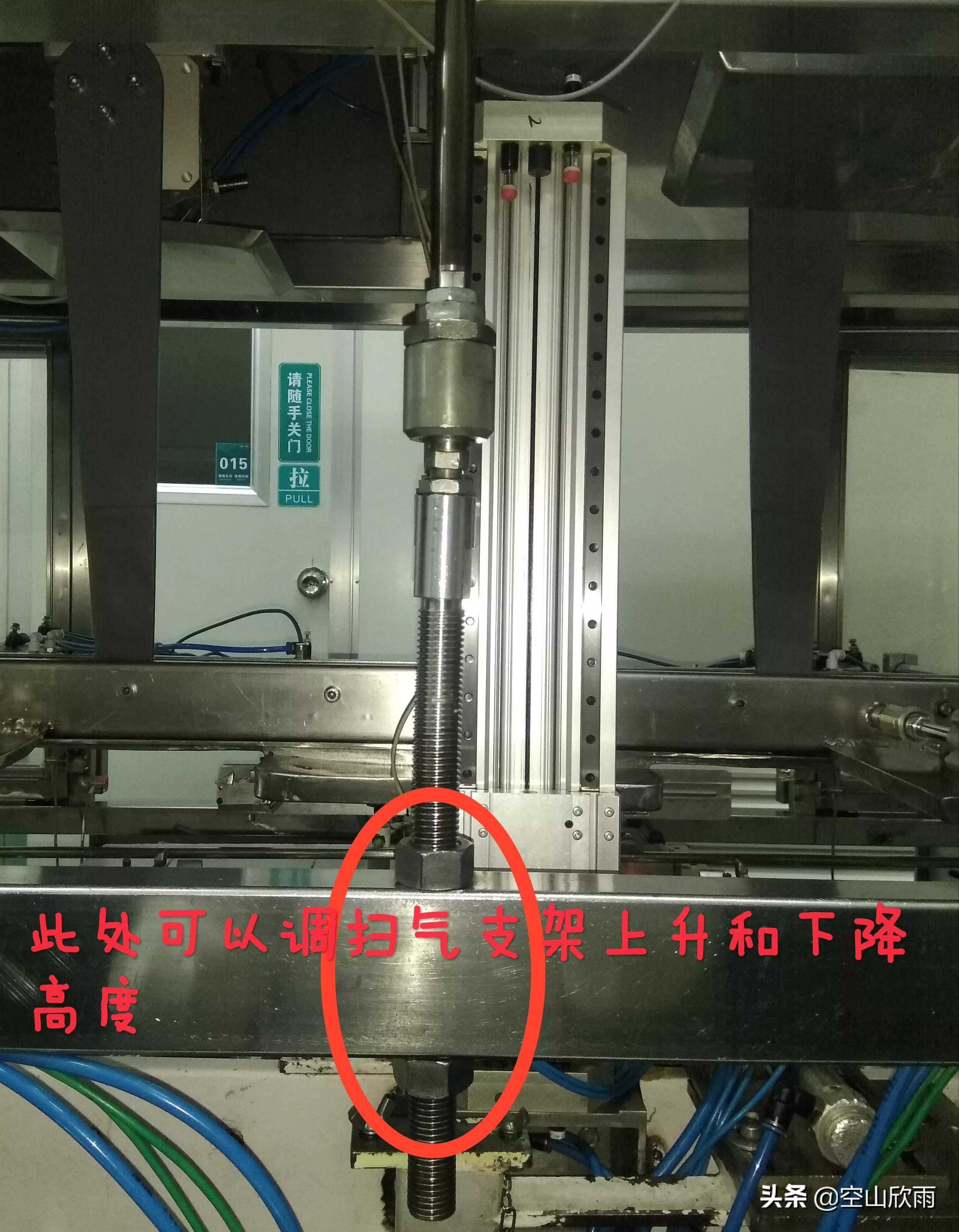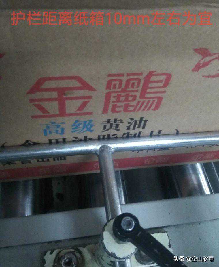 根据纸箱高度,移动螺丝在丝杆上的距离,调整扫气支架上升或下降的高度。一般以扫气板与纸箱内压痕折线等高为准。对于少数需要充氮的油品,扫气板需要相应往上抬升一点点,具体以实际生产情况为准,避免油从封口处挤出(扫气板高度如果调的较高,产品封口后PE袋内气体较多,可能造成纸箱损坏且不利于后面封箱)。
