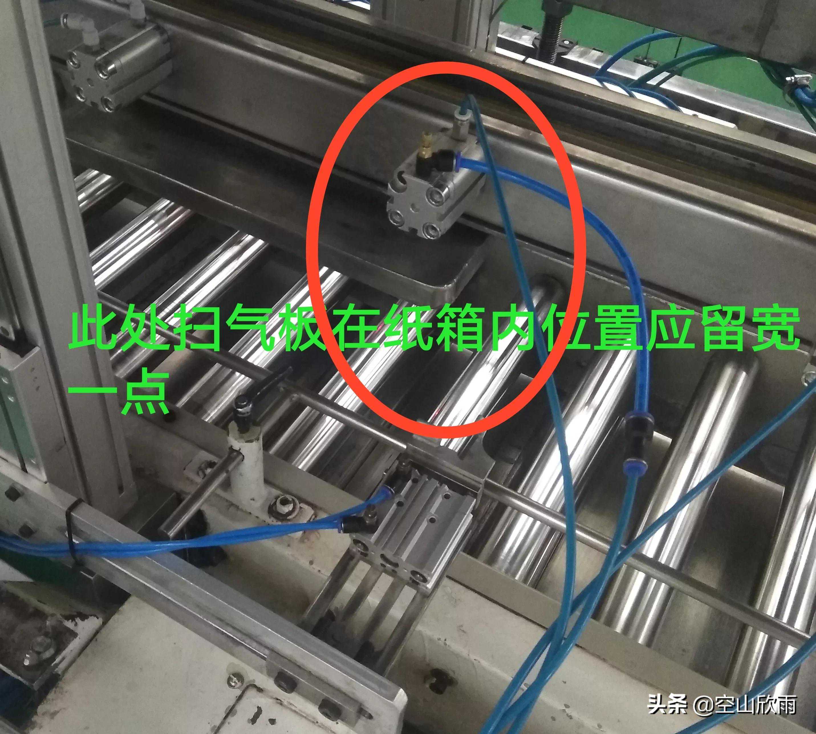 扫气板旁有小气缸的一边,扫气板在纸箱内的位置尽量留宽一点,以免正常生产过程中,扫气支架下降,气缸压坏纸箱。