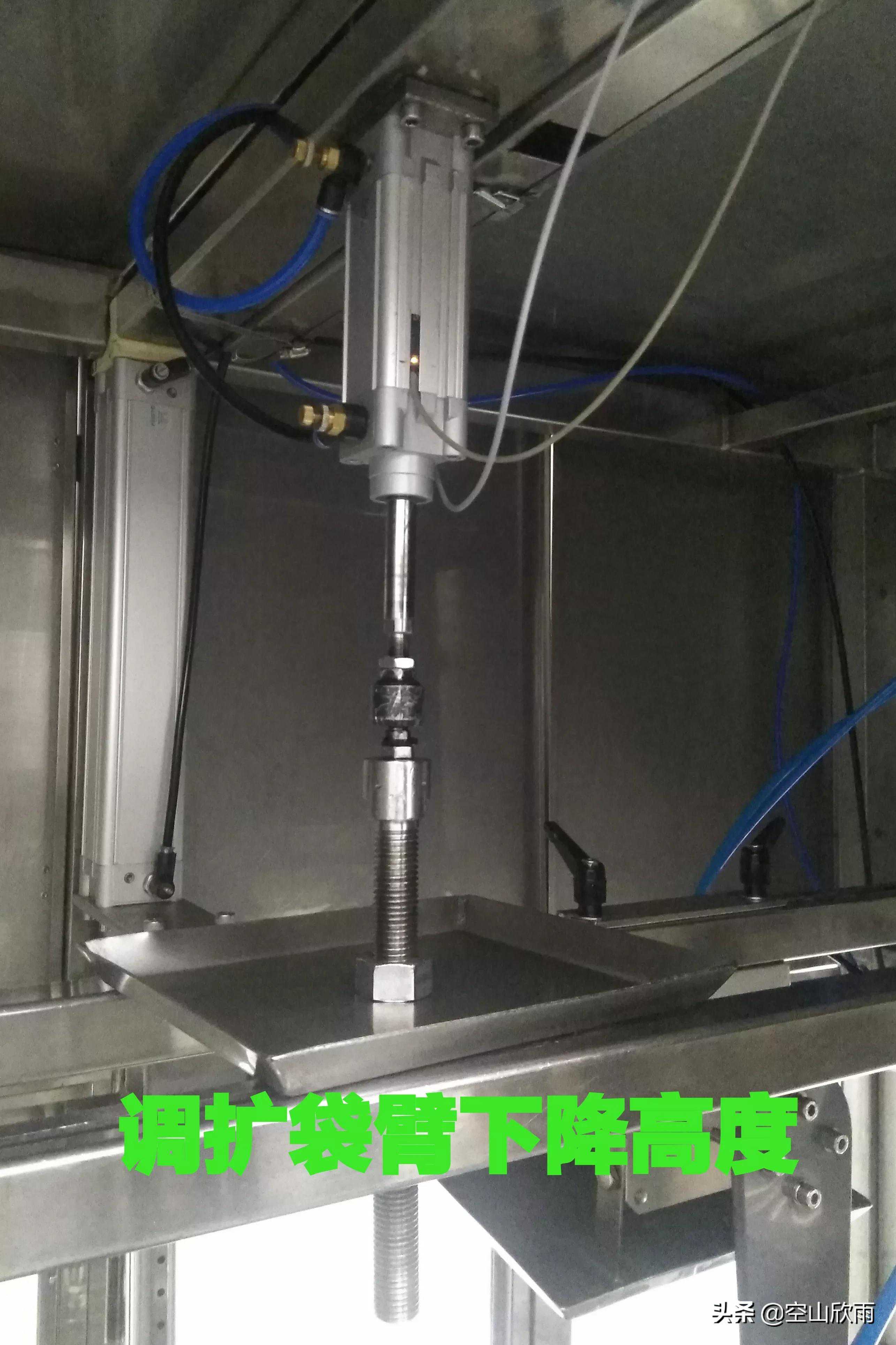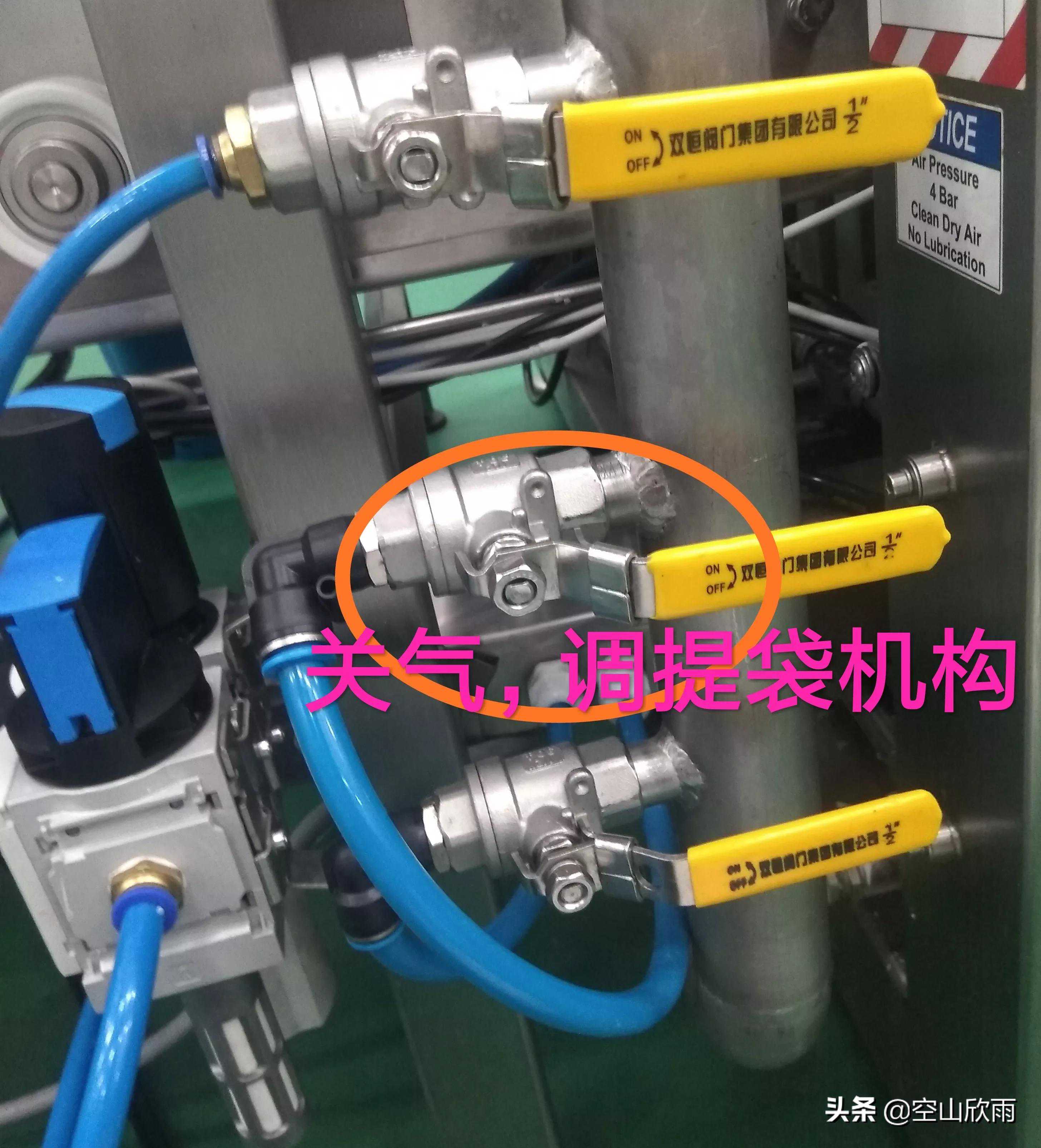 调整四个提袋小气缸位置之前,必须先将灌装机旁边的第二个压缩空气管路阀门关闭后再动手调试。