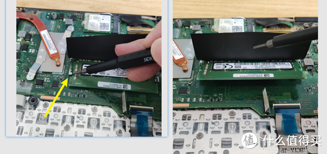 电池拿下来之后就可以拆内存条了,把内存条两边卡扣拨开就能把内存拿下来了
