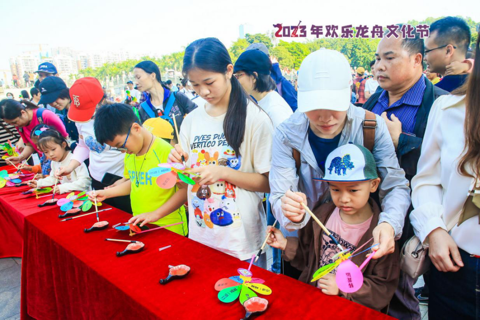 现场,巨型龙头和传统龙头将在牌坊与五行桥之间的空地列阵,市民游客笔蘸朱砂,纷纷为自己的行运风车“点红”,寓示“接龙福”。参观了巡游的高女士说,今年的龙舟节办得比往年的都要热闹,在这样的氛围里会不自觉地加深对自己家乡文化的认同感。和老伴、孙子一起为龙舟“应援”的冯先生自豪地展示了孙子昨晚在龙舟舞剧中的精彩表演,“我们是专门冲着今天的行运来的,希望通过这样的活动,可以让传承的种子埋进顺德年轻人的心里,还让更多人了解到顺德水乡的龙舟文化。”
