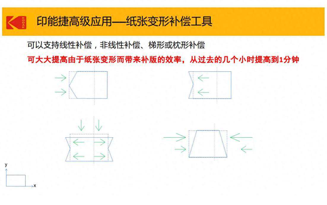有一个柯达的印刷软件WebGrowth,它可以通过精准的补偿计算一次性做出反向补偿,从而高效快速纠正套印误差,让原本需要花费数小时的调偏工作在十分钟左右的时间就得到解决,而且不需要去改动源文件(不用改源文件,重要的事情说两遍!),如下图所示的偏离类型都可以得到快速的纠正。