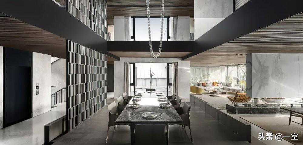 挑空开放的门厅及客厅,家具陈列呈现不规则形态,像艺术品一般来进行陈列。墨黑的沙发、巨型水墨地毯、墙面的纸墨装置,都阐述出了东方美学的水墨文化。