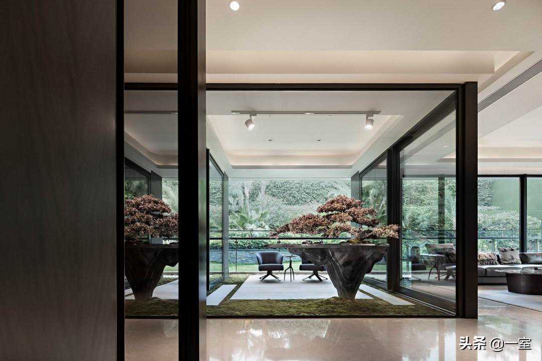 白鹭郡西的样板间水之墅,室内由李玮珉设计打造。穿过玄关,来到开阔的社交空间——客厅和茶室,大面积玻璃的使用,将户外风景尽收眼底,拉近了人与自然的关系。