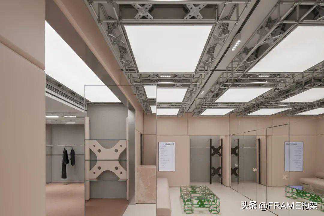 对零售商业空而言,打造视觉锤是我们秉承的一个设计手法。PlaySERIOUS采用了蝶形桁架这个系统演变,制造一种工业粗糙感和精致时尚的对撞。将蝶形桁架作为主要设计元素,进行变形与重组,在不同比例与质感中具有不同的表现。如一个特定的符号,创建空间记忆的锚点。