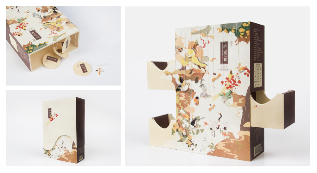 包装插画是根据庐山云雾茶的传说进行设计,每只鸟儿的嘴巴里都叼着茶籽。冲泡茶时将鸟儿取下,每只鸟儿都将给你带来不一样的品茶体验。“拨开云雾见日明”等待、坚持,美好的事物就会随之发生。