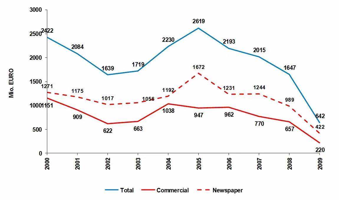 我们先来看看2000年-2009年的统计数据。2000年时,全球轮转印刷机市场总量可以达到24.22亿欧元,其中,商轮为11.51亿欧元,报轮为12.71亿欧元,基本上处于平分秋色的位置。其后经过几年的起伏,在2005年达到了历史高点。那一年,全球轮转印刷机市场总量可以达到26.19亿欧元。其中,商轮是10.38亿欧元,而报轮是16.72亿欧元。但随后就是急剧地下降。到了2009年,全球轮转印刷机的市场总量仅为6.42亿欧元,其中商轮为2.20亿欧元,报轮为4.22亿欧元。