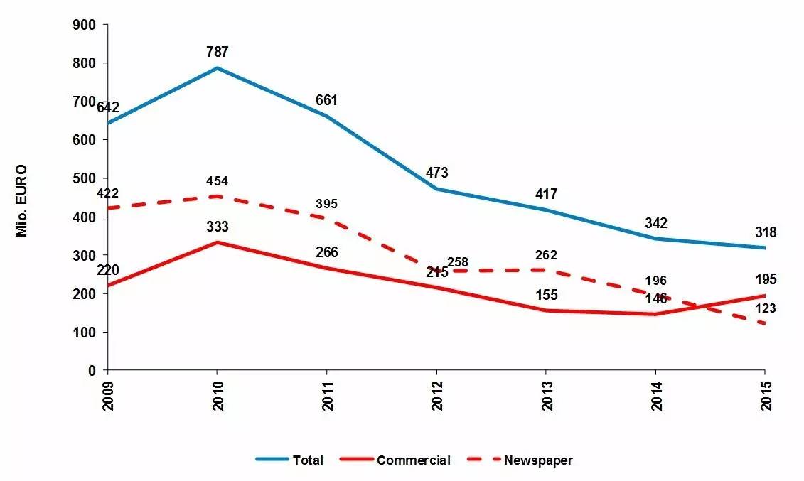 我们再来看看2009年-2015年的统计数据。经历了比较惨淡的下滑以后,2010年,全球轮转印刷机市场总量略有提升,达到7.87亿元,但随之继续下降。到2015年,全球市场仅为3.18亿欧元,其中,商轮为1.95亿欧元,报轮为1.23亿欧元。同时,2015年也是全球商轮市场总量在16年内首次超越报轮。事实上,自2009年以来,全球商轮市场的表现一直较为稳定。相比之下,报轮的急剧下滑拖累了全球轮转印刷机市场的总体表现。