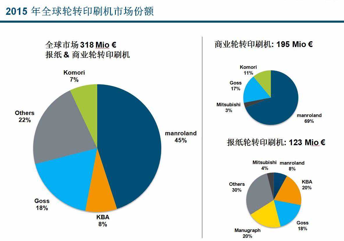 另一方面,尽管市场在逐渐缩小,而且缩小幅度惊人,但在有限的市场环境之中,曼罗兰轮转印刷系统一直在顽强地发展之中。据其公布的数据显示,在2012年,也就是曼罗兰轮转印刷系统刚刚成立之时,其在轮转印刷市场的占有率仅为21%,但经过几年的发展,在2015年,这一数字增加到了45%。其中,在商轮市场中的占比为63%,在报轮市场的占比为8%。虽然报轮市场的成绩不算理想,但曼罗兰轮转印刷系统在商轮市场中的表现却相当抢眼。可以想象,进一步巩固曼罗兰轮转印刷系统在市场的领先地位也成为公司在未来工作的重点。因此,选择此时在中国开设销售子公司的做法也是可以理解的。