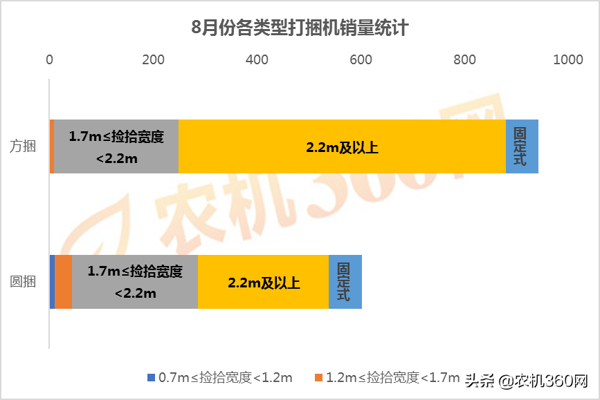 从打捆机销售情况来看,8月份补贴销售的方捆机销量高于圆捆机,捡拾宽度在2.2米及以上的打捆机销量高于其他捡拾宽度打捆机。