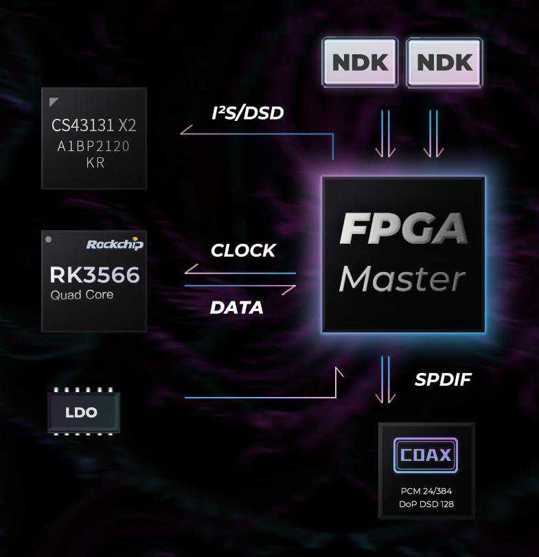 DX170另一亮点在于,将艾巴索旗舰播放器上的“双控”技术下放到了中端播放器上。以自研的FPGA-Master作为音频主控,直接向SoC请求数据,起到数据重组保持信号稳定的作用。并且同步生成所有时钟,配合两颗NDK飞秒晶振,实现全同步单一时钟源。简单来说,原本需要靠SoC调动音频数据,系统优先级不高。加入FPGA-Master之后,相当为数字音频开拓了一条直达通道,由FPGA-Master直接请求数据,将音频处理提到了第一优先级。DX170的数字音频系统拥有与艾巴索的旗舰播放器一样的配置,因此理论上抖动更小,声音也会更为纯净。