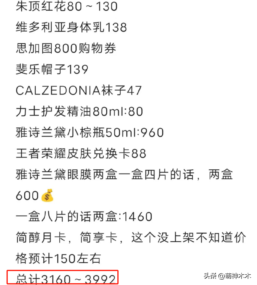 杨紫虽然代言数量有些少,但礼盒却不小,甚至还有高奢品牌,总价也是4000多元。