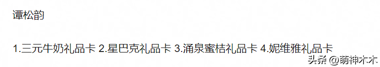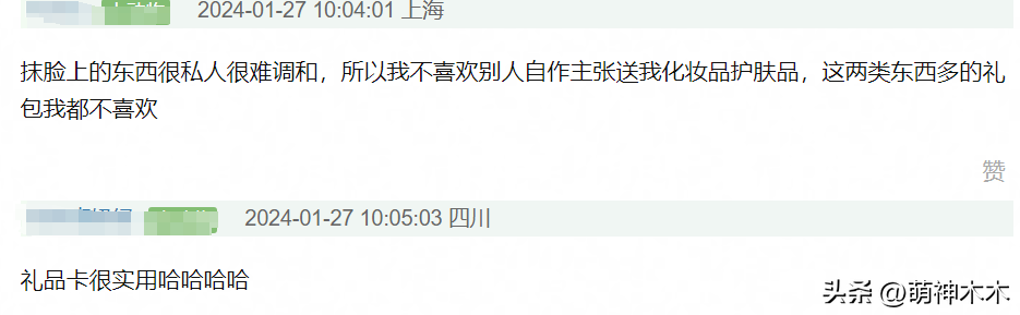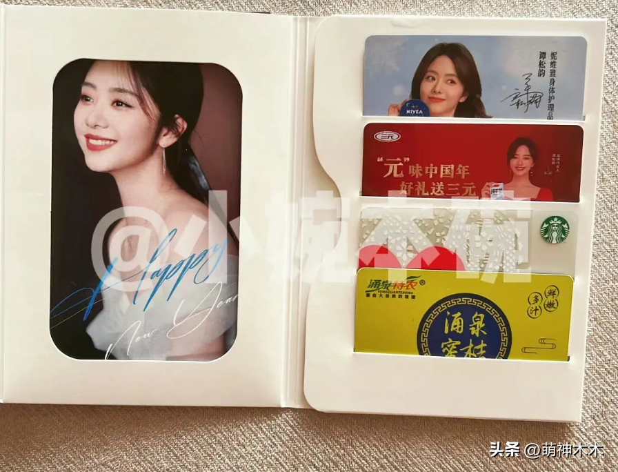 也有些明星送的礼物虽然没什么代言,但看起来就很实惠。比如谭松韵送的各种礼品卡。每个人的护肤和饮食标准都不一样,这个礼品卡就很自由,大有“想要什么拿去刷”的感觉。