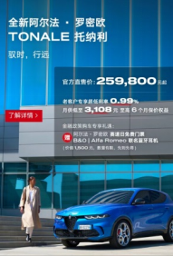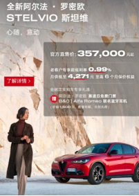 当下买车老客户专享超低利率0.99%。选择指定车型金融政策购车更享专属礼遇:阿尔法罗密欧赛道日门票,阿尔法罗密欧联名蓝牙耳机,或阿尔法罗密欧限量版1:2赛车头盔!(数量有限,先到先得)