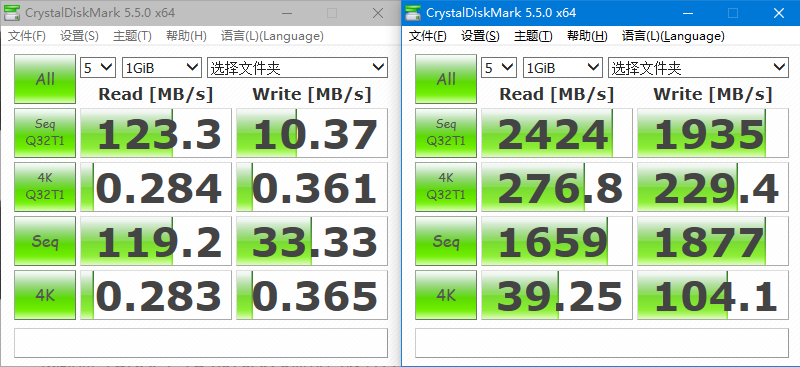 1TB私以为其实不如购买固态硬盘,sata3接口固态硬盘的连续读写速度大约是此容量机械硬盘的5倍,4k读写(小文件读写)更是强出天际(下图左侧为西数black5t移动机械硬盘,右侧为西数SN550固态硬盘),而且大容量固态也不贵多少。