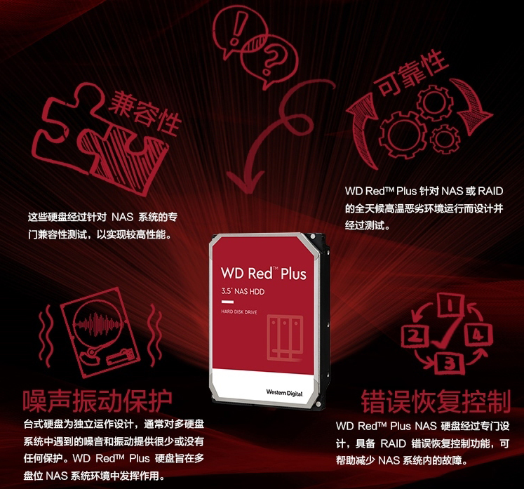 NAS盘使用稳定可靠的技术和优质用料,稳定性很好、性能不错,厂商还针对NAS场景进行了特定优化,以我喜欢的西部数据红盘Plus系列来说: