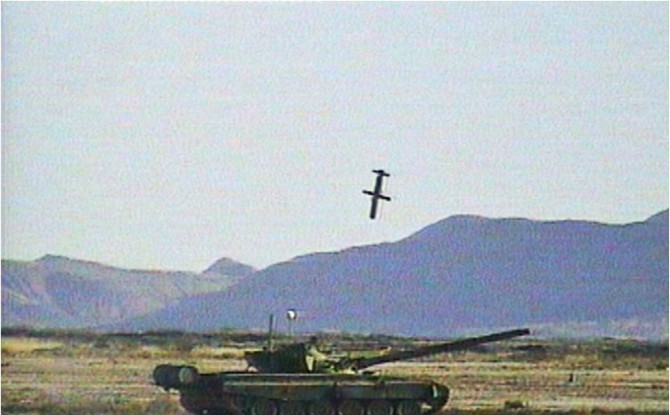 ▲试验中,“网火”系统发射的精确攻击导弹,以攻顶方式命中T-72坦克的瞬间