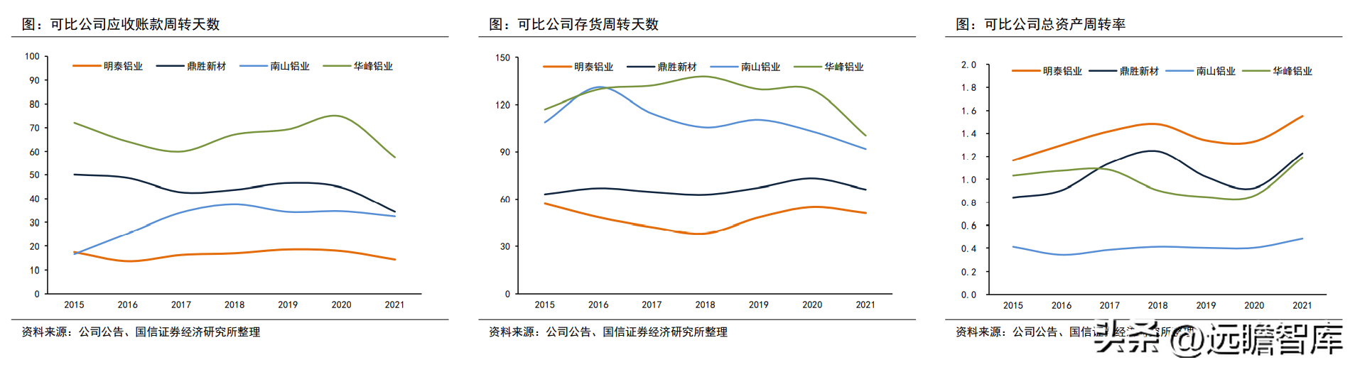 •同行业可比公司当中,应收账款周转天数较高的企业,主因其客户绝大部分来自汽车产业链,账期较长。南山铝业存货较多,主因公司从事铝全产业链经营,需要囤积铝土矿和煤炭等大宗原材料。