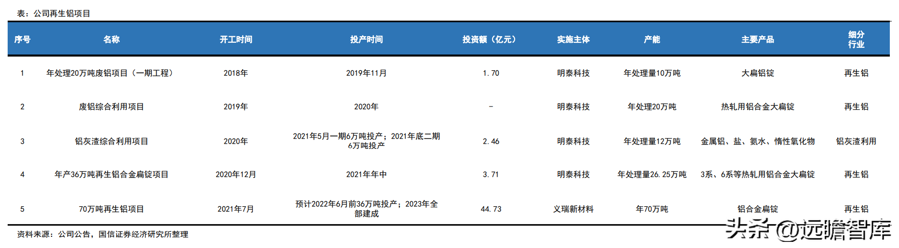 2021年公司韩国光阳铝业项目新增产能12万吨,明晟新材料项目新增产能30万吨;义瑞新材项目新增70万吨再生铝及绿色新型铝合金材料产能,公司产能规模进一步扩大。