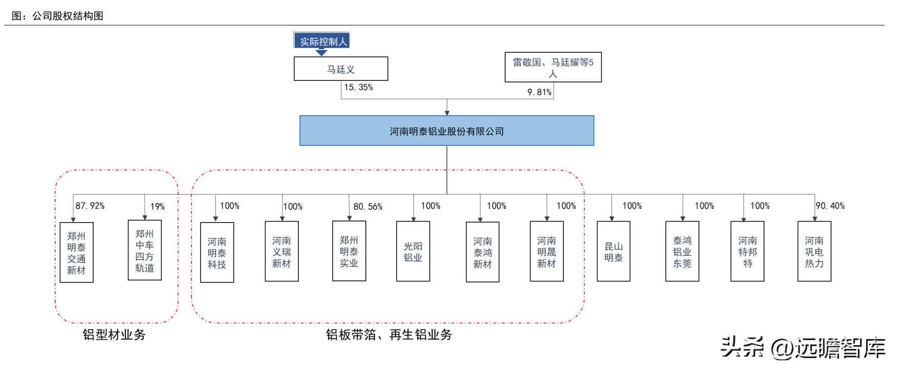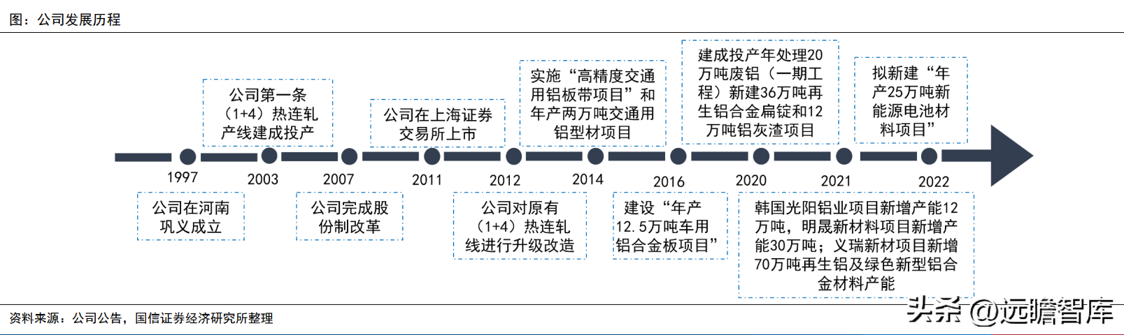 一、公司概况:国内铝压延加工行业的龙头企业◆公司是国内铝压延加工行业的龙头。河南明泰铝业股份有限公司成立于1997年,于2011年在上海证券交易所上市。公司主要经营铝板带箔、铝型材、再生铝等业务,产品广泛应用于新能源材料、食品包装、医用包装等多个领域。历经多年发展,公司现已成为国内铝压延加工行业的龙头企业。