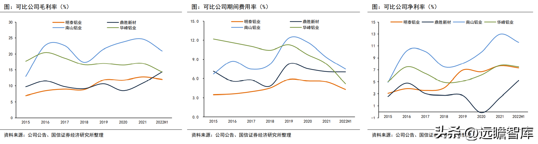 明泰铝业的产品多为普通铝合金板带,产品附加值在几家可比公司当中并不突出;华峰铝业主营定制化程度较高的钎焊复合材料,毛利率较高;鼎胜新材主营各类铝箔材料,近两年凭借动力电池铝箔毛利率大幅提升;南山铝业除了主营高端铝加工业务外,还拥有上游的氧化铝、电解铝业务,抬高了公司总体销售毛利率。