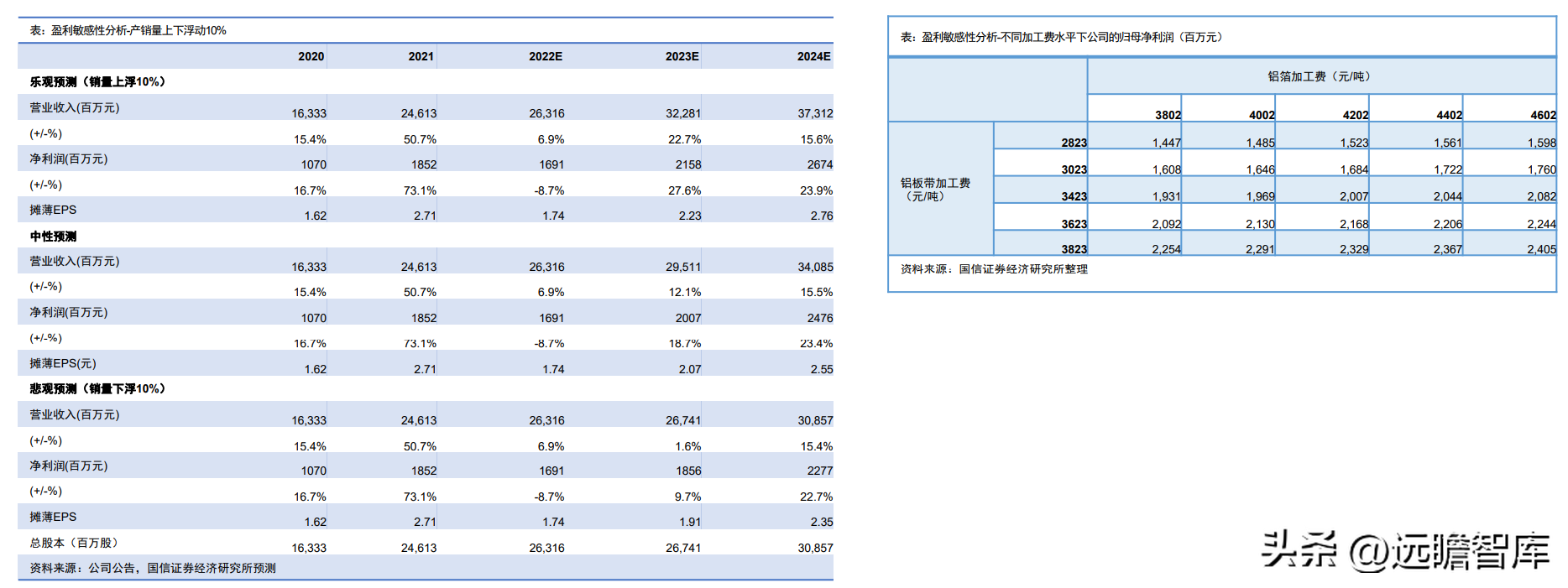 下表列示的加工费是根据公司产品售价及原铝价格倒推出的加工费,并非公司真实加工费,但不影响盈利预测。右表中列举铝板带和铝箔在不同加工费水平下,公司2023年归母净利润的变化情况。