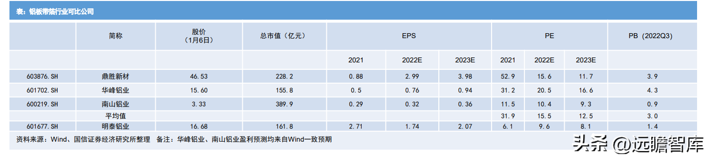 明泰铝业的主营业务为铝板带箔加工业务和再生铝业务,我们选取A股主营铝板带箔的南山铝业、鼎胜新材、华峰铝业三家公司作为可比公司进行对比。
