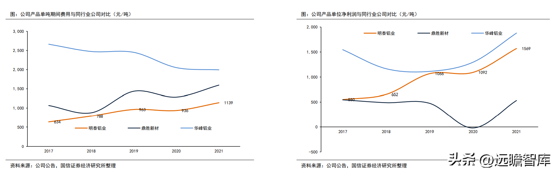 •明泰铝业的产品多为普通铝合金板带,产品附加值在业内并不算高,毛利率低于同行业可比公司;但是得益于公司极强的成本控制能力及高周转,产品产销量大且快进快出,摊薄了期间费用,公司期间费用率明显低于同行业可比公司,因而公司产品净利率能与行业内中高端产品齐平。