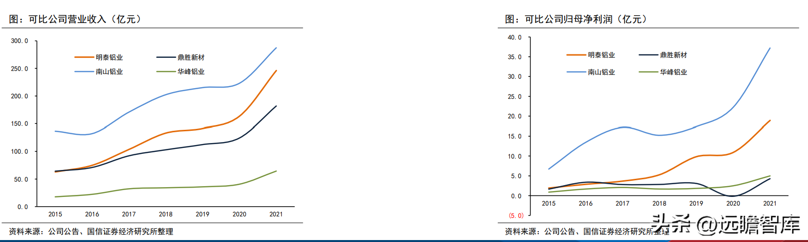 •明泰铝业的主营业务为铝板带箔加工业务和再生铝业务,我们选取A股主营铝板带箔的南山铝业、鼎胜新材、华峰铝业三家公司作为可比公司进行对比,分析公司在行业内的财务水平和运营状况。