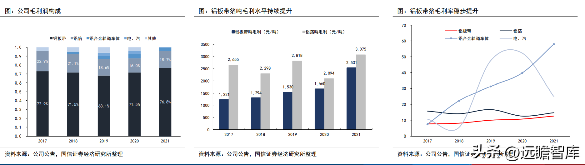 •近年来公司的铝板带产品单位毛利润增幅非常明显,从2017年的1221元/吨增加到2021年2531元/吨。公司单位毛利润增加主要来自两个方面,一是产品升级,二是使用再生铝降本,三是2021年市场供需格局好,加工费提升。