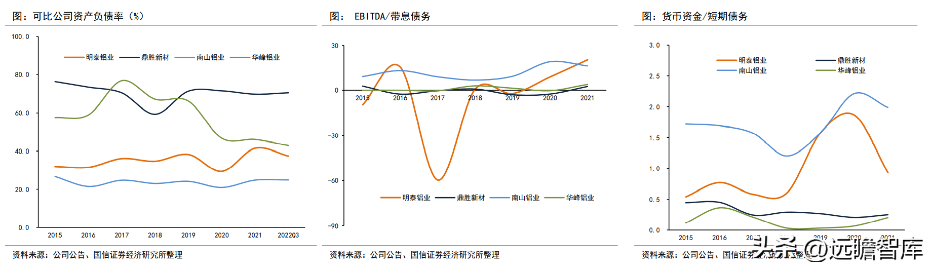 •截至2022年9月末,公司的资产负债率为37%,在同行业可比公司中处于中等偏低水平。近两年来随着铝价大幅上涨以及公司不断扩张产能,对营运资金需求提高,部分偿债能力指标有所下降,但在行业内仍处于较好水平。