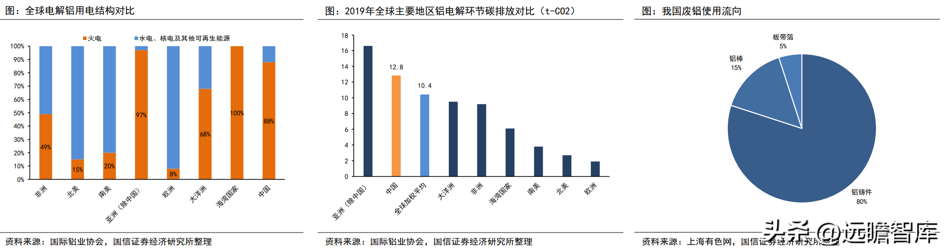 根据国际铝协数据,2019年全球电解铝能源结构中,煤电占60%,水电站24.8%。我国能源禀赋决定了我国铝工业用电以火电为主,我国电解铝行业中煤电占比高达88%,远高于全球平均水平,导致我国电解铝单位排放量偏高,具有更大的减排压力。