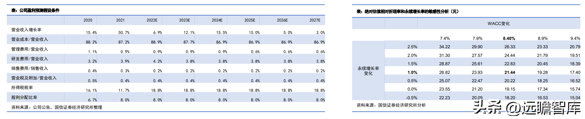 我们采取了绝对估值和相对估值方法,多角度综合得出公司的合理估值在20.7-24.8元之间,但该估值是建立在相关假设前提基础上的,特别是对公司未来几年自由现金流的计算、加权平均资本成本(WACC)的计算、TV的假定和可比公司的估值参数的选定,都融入了很多个人的判断,进而导致估值出现偏差的风险,具体来说: