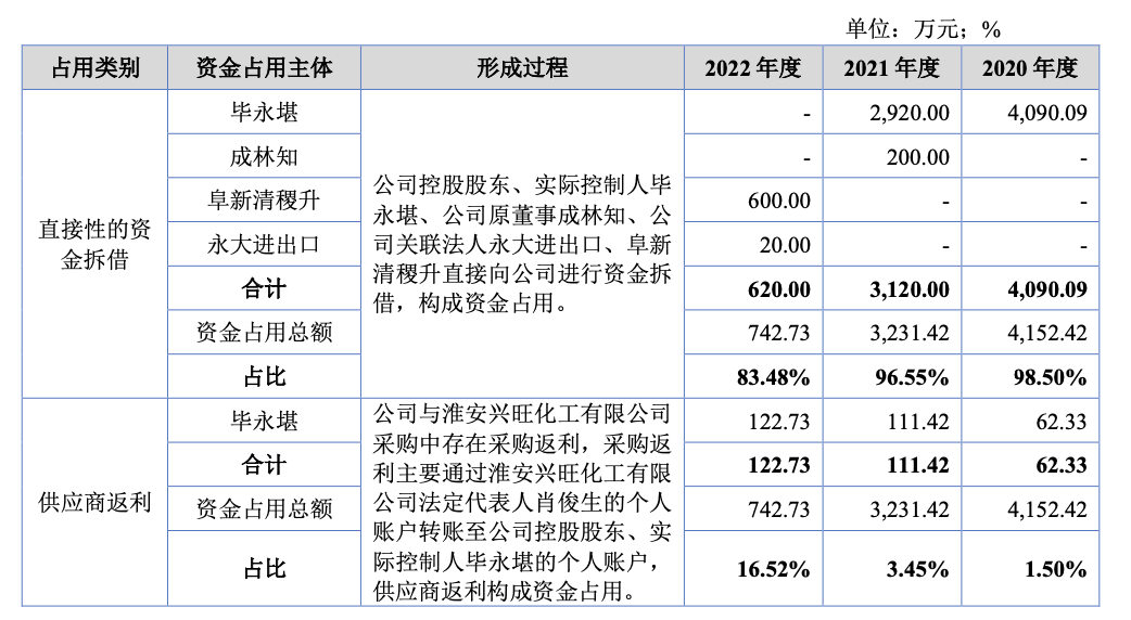 但资金占用的行为仍然存在。其中实控人毕永堪2020年-2022年资金占用金额分别为4152.42万元、3031.42万元、122.73万元。资金占用日最高余额分别达到2546.84万元、1587万元、296.48万元,占挂牌公司最近一期经审计净资产分别为31.97%、16.81%、3.51%。