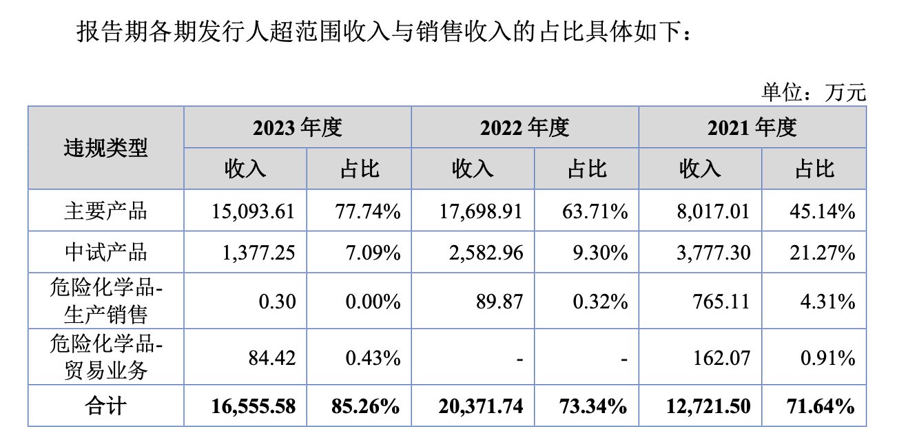 此外,永创医药主要产品2,4-二氯-3,5-二硝基三氟甲苯存在超产能生产情形,2020年超出许可产能64.97吨,占批复产能6.50%,2022年超出许可产能68.51吨,占批复产能6.85%。