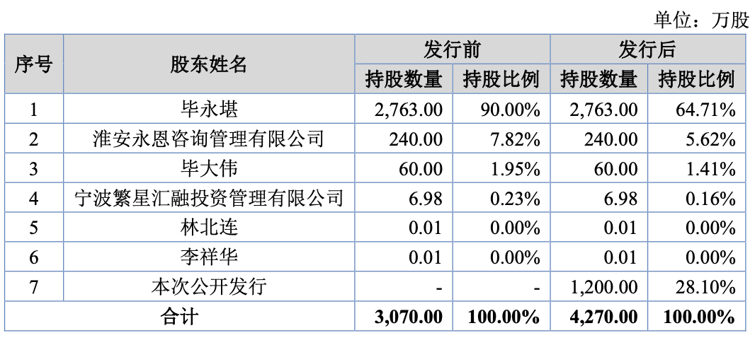 实控人控股90%,上市前分红1.2亿IPO前,毕永堪直接持有公司2763万股股份,占本次发行前公司总股本的90.00%,为公司的控股股东、实际控制人。此外,毕永堪的儿子毕大伟持股1.95%。