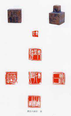 传世六面印实物较少。这种呈"凸"字形的印章,上面的印鼻有孔,可以穿带而佩,鼻端作一小印,连同其余五个印面故称六面印。传世六面印的一种典型风格为带边白文,每字为一行,密上疏下,印文竖笔多引长下垂,末端尖细,犹如悬针,所以有"悬针篆"的俗名。这种风格虽然尚有笔意舒展、疏密相映的好处,但很容易流于庸俗,远不及汉印的相茂,故历来篆刻家只偶一为之。