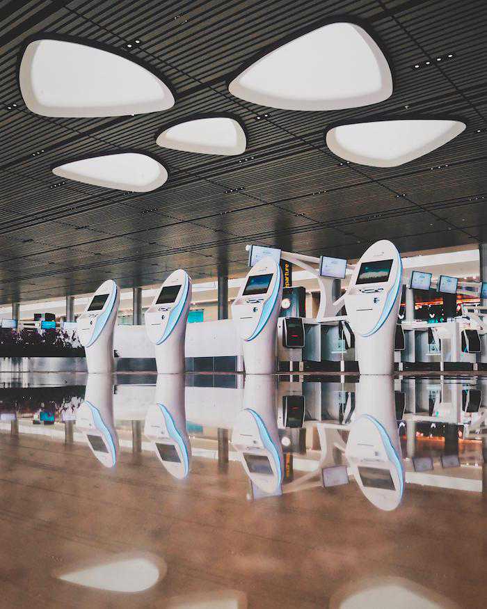 新加坡樟宜机场也早在2017年便开始尝试自助化,包括自助值机亭、自助行李托运柜机、自动通关闸门等。四号航站楼正在试验“机器人运营模式”:自动驾驶车辆会定位卸载行李,旅客在传送带上提取完机器人传送的行李后,便可以搭乘无人驾驶出租车离开;在走向登机口时或许还能遇见“穿着”代表不同种族贴纸的扫地机器人。