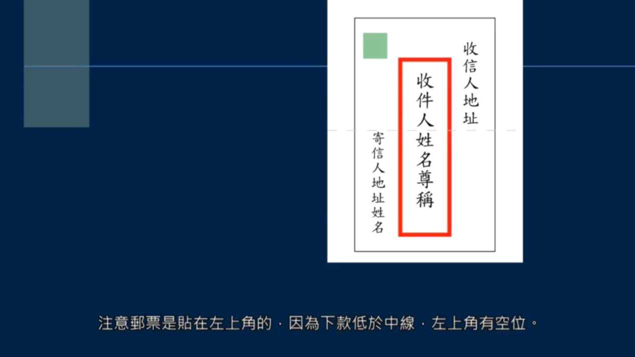 旧时中式信封的写法,是分三行,跟东坡写一行不同。收信人姓名称呼写在中间红框中,注意邮票是贴在左上角的,因为下款低于中线,左上角有空位。